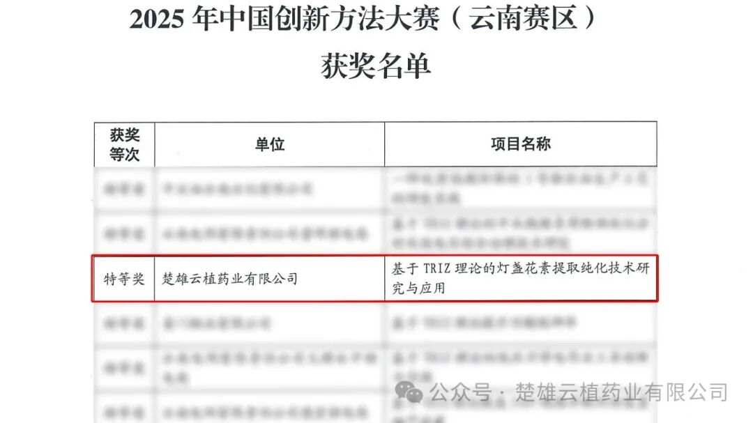 近日,2025年中国创新方法大赛(云南赛区)正式落下帷幕。云南省工投集团所属云植药业子企业——楚雄云植药业有限公司(以下简称“楚雄云植”),凭借“基于TRIZ理论的灯盏花素提取纯化技术研究与应用”项目,在全省350个参赛项目中脱颖而出,再次在中国创新方法大赛(云南赛区)中荣获特等奖。这是楚雄云植继2024年以“三七总皂苷分离技术”摘得中国创新方法大赛全国总决赛三等奖、云南赛区特等奖后,在创新领域的又一次重大突破。