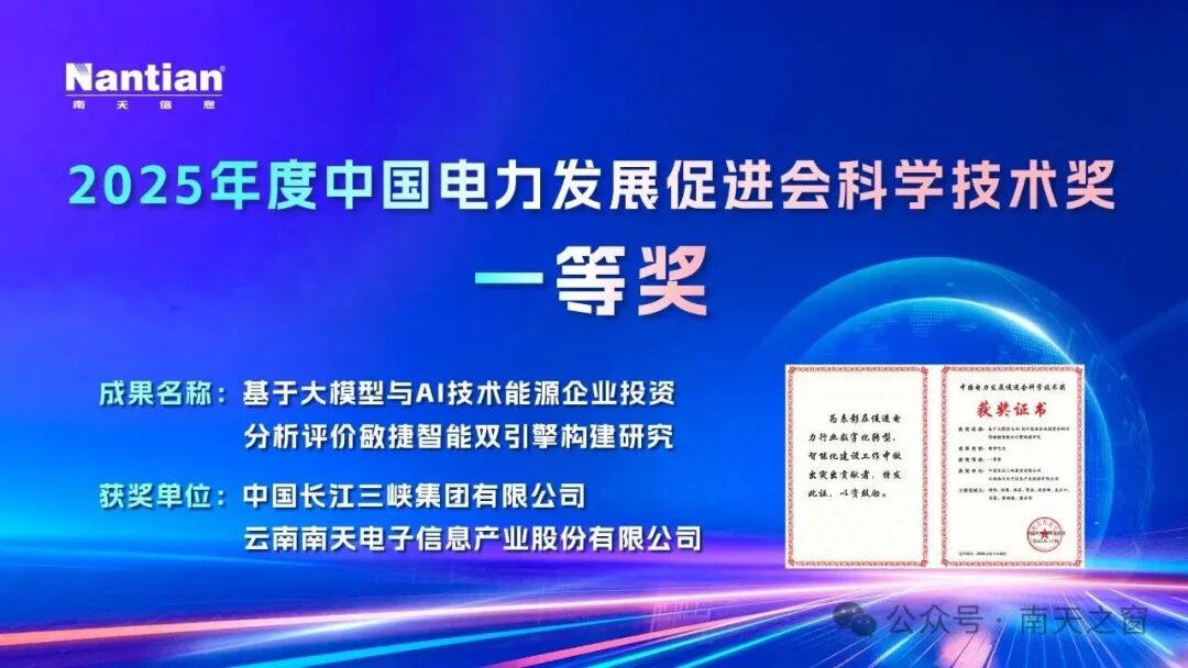 近日,2025年度中国电力发展促进会科学技术奖获奖名单发布,云南省工投集团所属南天信息与三峡集团共建的“基于大模型与AI技术能源企业投资分析评价敏捷智能双引擎构建研究”成果获得一等奖。