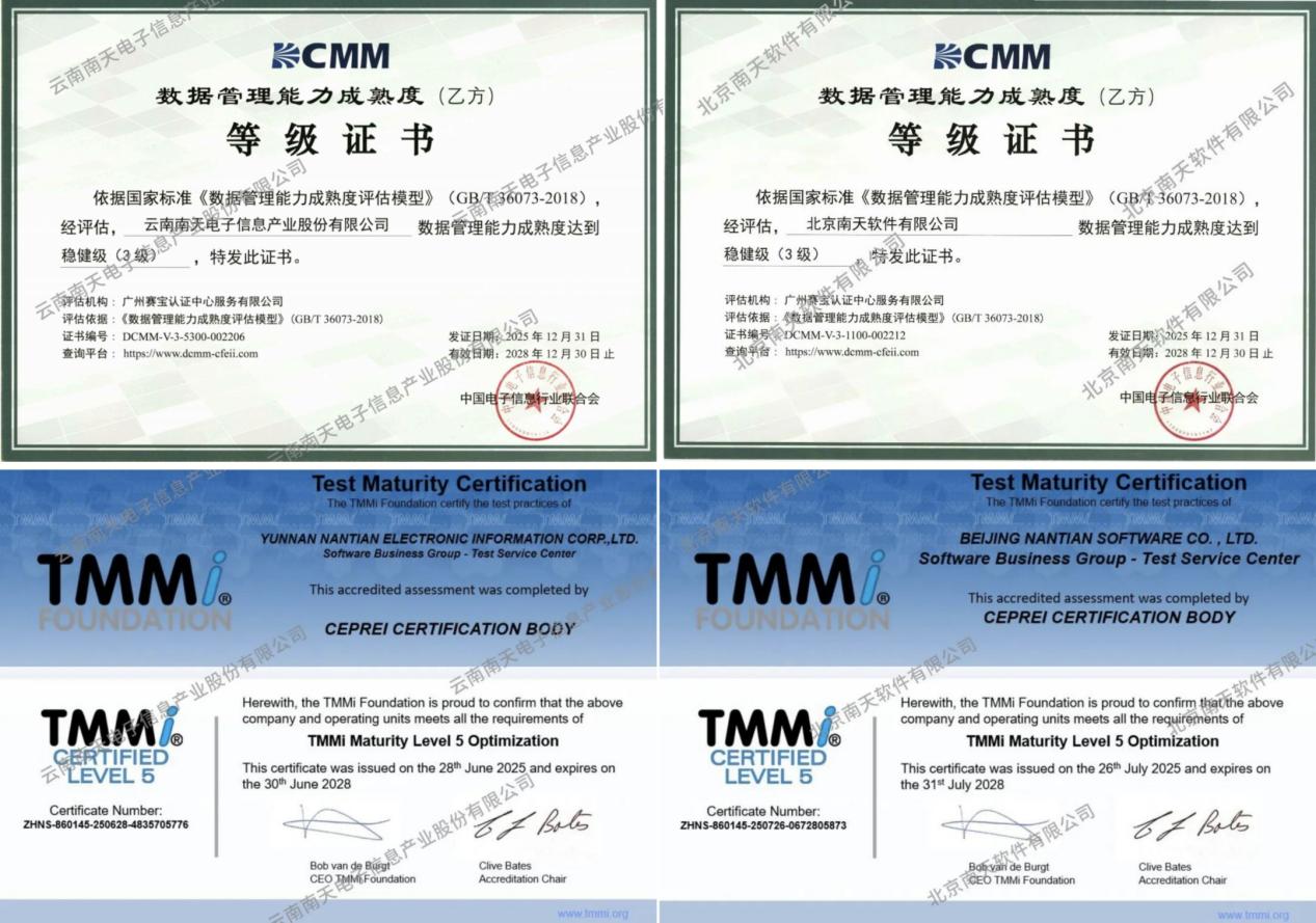 TMMi5级是全球公认的软件测试成熟度最高等级,代表组织在测试流程优化、质量风险管控、测试效率提升等方面达到全球领先水平。DCMM是我国数据管理领域首个国家标准(GB/T 36073-2018),是衡量企业数据管理能力的核心资质证明。南天信息和南天软件此次均通过两项评估,代表南天信息能够为客户提供高质量的数据服务支撑,以及更稳定、更可靠的技术产品与服务。充分彰显了南天信息在数据管理领域的扎实积淀,为其在金融、政务、能源等对数据管理能力有硬性要求的行业市场中增添了新的竞争力。
