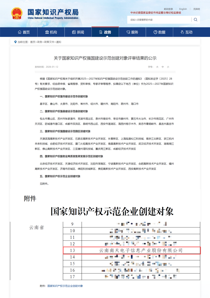 近日,国家知识产权局公示了2025—2027年知识产权强国建设示范创建对象评审结果,云南省工投集团所属南天信息入选“国家知识产权示范企业创建对象”。这是南天信息在持续强化知识产权创造与管理、积累丰硕创新成果基础上,实现的又一重要突破。