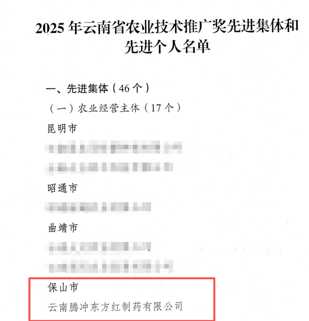 喜报!云南腾冲东方红制药有限公司荣获2025年云南省农业技术推...