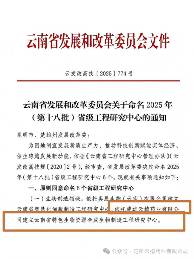 楚雄云植将以“工程研究中心”的建设为契机,向着技术领先、特色鲜明、专业化的植物原料药一流企业迈进,推动合成生物学与智能制造深度融合,为濒危药用资源的替代生产探索出一条可复制、可推广的新模式,助力云南从“生物资源大省”向“生物制造强省”跨越,为“滇中药谷”建设注入核心动能,为合成生物制造产业发展贡献云植力量。